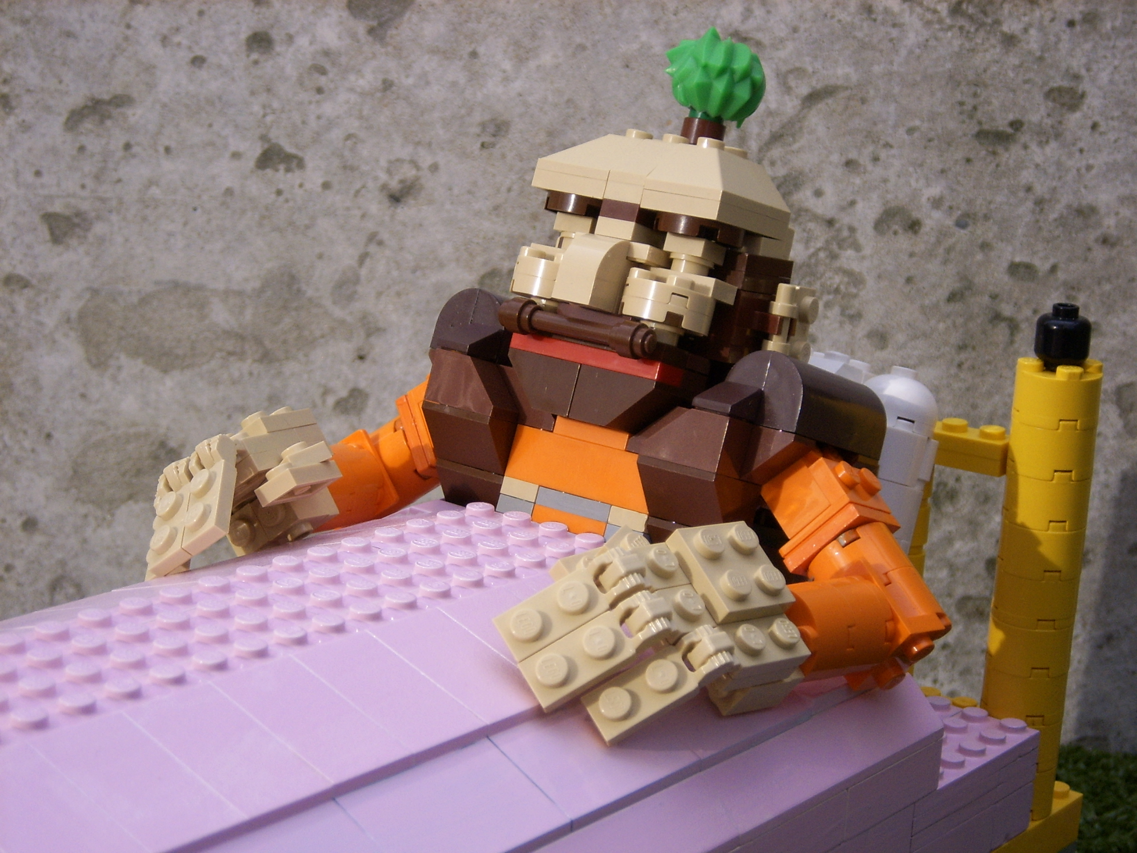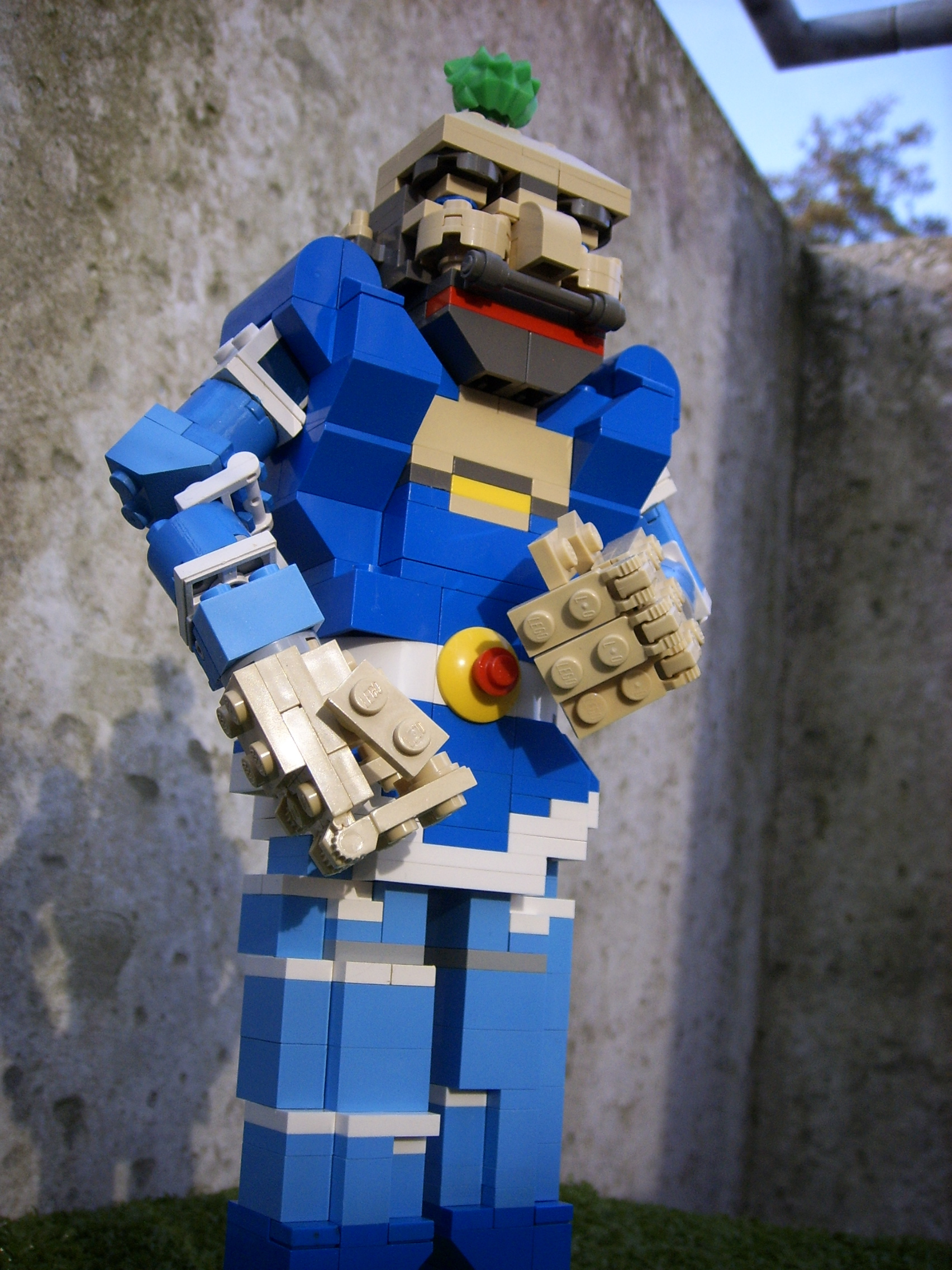 Reus Ooit was wel iets moeilijker. Deze reus staat rechtop, met één voet iets naar voren en in zijn rechter hand heeft hij een touw vast. Die houding van de arm en hand levert een complex bouwwerkje op. Daarbij wilde ik de armen en benen het liefst in licht blauw, een kleur waarvan maar weinig blokjes gemaakt zijn. De meeste blokjes in de armen moeten nog steeds geschilderd worden.