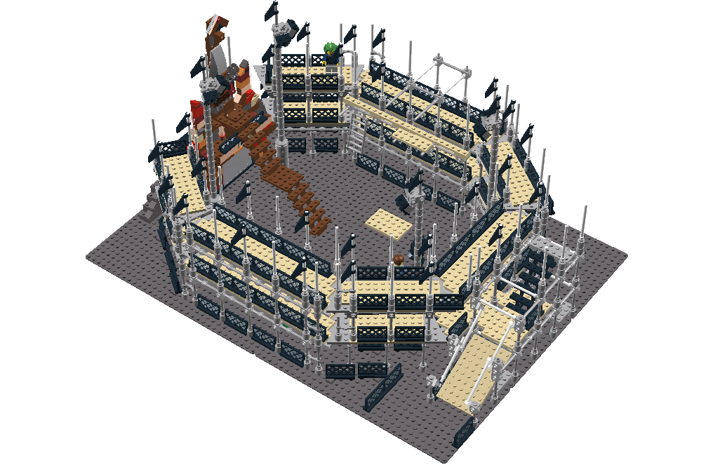 Om dit alles na te bouwen met LEGO-blokjes moest ik een nieuwe bouwtechniek ontwikkelen. Want hoe bouw je steigers met LEGO-blokjes? En hoe bouw je ze zo dat er een ronde arena ontstaat? Na heel lang stoeien met het ontwerpprogrammaatje van LEGO® (mijn PC trok het bijna niet meer) , kwam ik tot de volgende constructie: