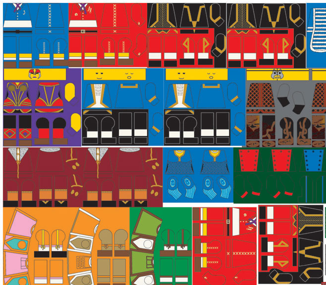 Maar voordat ik daaraan kon beginnen, moest ik eerst een aantal digitale ontwerpen maken om te kunnen printen. De velletjes decal papier zijn niet goedkoop; ongeveer EUR 3,- per vel! Dat vel moest dus wel helemaal vol voordat je kunt gaan printen. En er kunnen me veel poppetjes op een vel… Nadat ik een heel vel vol had, (zie afbeelding hiernaast) kon ik aan de slag. De meeste ontwerpen had ik meerdere malen afgedrukt. Als het zou mislukken, kon ik het nog een keer proberen en als het er goed zou gaan, kon ik er meerdere maken om wellicht te verkopen in mijn eigen BrickLink winkeltje.
