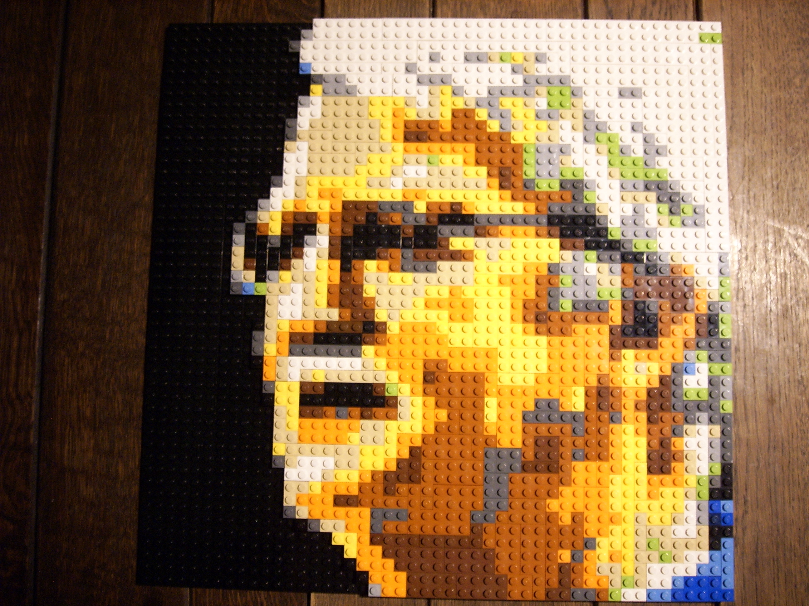 Met LEGO-blokjes kun je niet alleen bouwwerken bouwen, je kunt er ook mozaïeken mee maken. Het moet nu ongeveer een jaar geleden zijn dat ik begon aan mijn eerste mozaïek. Na afronden van de bouw van het Manegetheater had ik een aantal van die grote 48×48 nops grondplaten over. Het leek me leuk voor de verjaardag van mijn vader een portret van hem te maken. Al gauw kreeg ik de smaak te pakken en maakte ook een portret van mijn broer, die nu boven de TV in mijn woonkamer hangt.