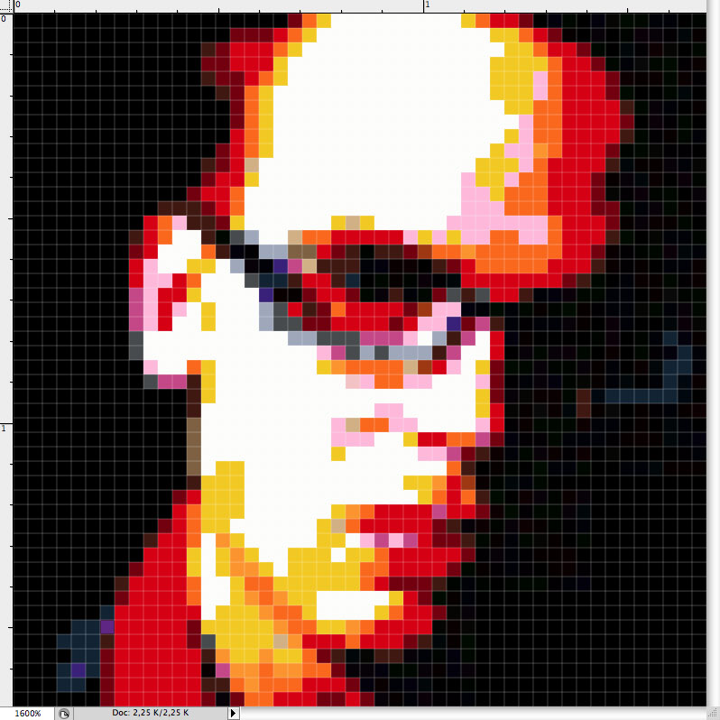Daarna volgde het omzetten naar LEGO-kleuren en het terugvormen van de verhoudingen. Zo ontstaat er een grid van pixels in dezelfde maat als de LEGO-plaatjes.