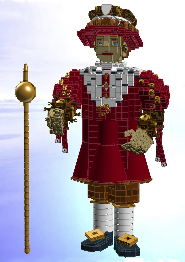 Nadat alle onderdelen binnen waren, kon ik eindelijk de pop helemaal in elkaar zetten, waarna ik alleen de staf nog even goud moest spuiten. Met name de armen bleken erg gammel, maar door een paar kleine veranderingen werd dat al minder. Inmiddels is de pop voor het grootste deel gelijmd om beter stand te houden tijdens tentoonstellingen en heeft hij een eigen, speciaal op maat gemaakte transportdoos.
